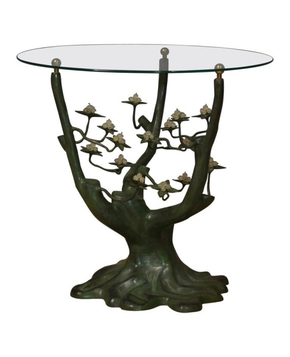 Splendido e decorativo tavolo-scultura, con una massiccia base in ottone a forma di albero....