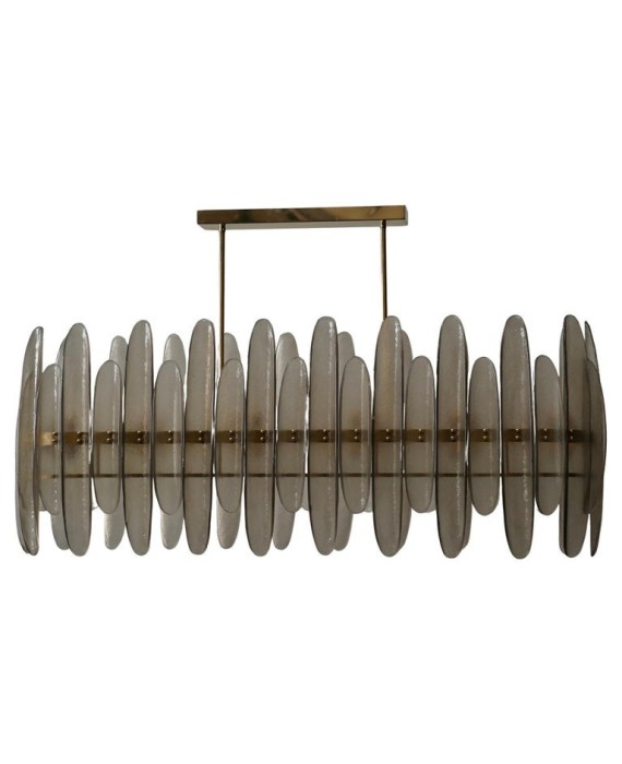 Lampadario di Murano dal design allungato, con montatura in ottone e vetro fumé singolo. La...