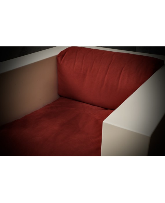 Poltrona storica mod. Saratoga in legno laccato bianco con cuscini in bellissimo tessuto rosso...